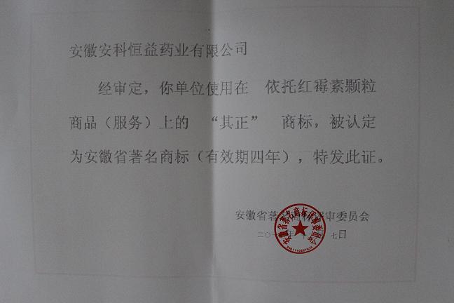 近日,公司收到《2017年安徽省著名商標認定公告》,公司產品依托紅霉素顆粒其商標“其正”經安徽省著名商標評審委員會評審通過,認定為“安徽省著名商標”。該商標是我公司取得的第三件省著名商標(前兩件分別是“天井”牌氨咖黃敏膠囊、恒迪克牌頭孢克洛分散片)。